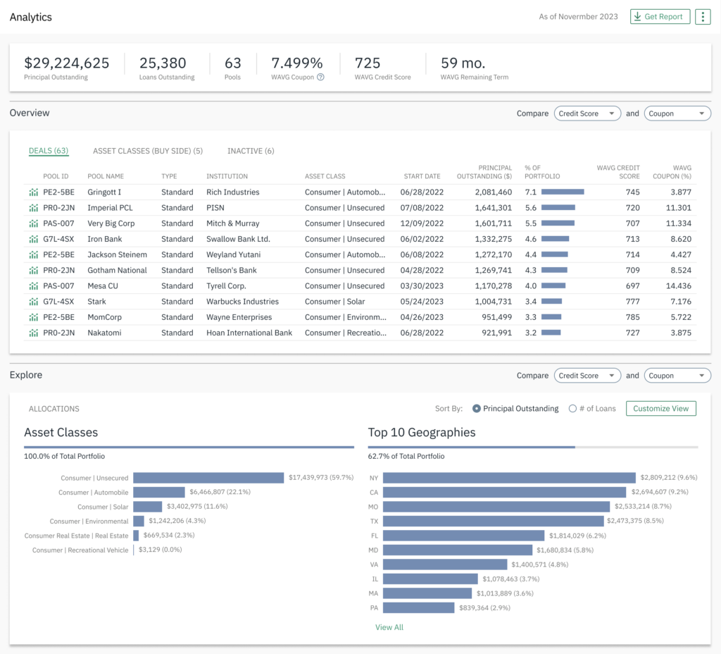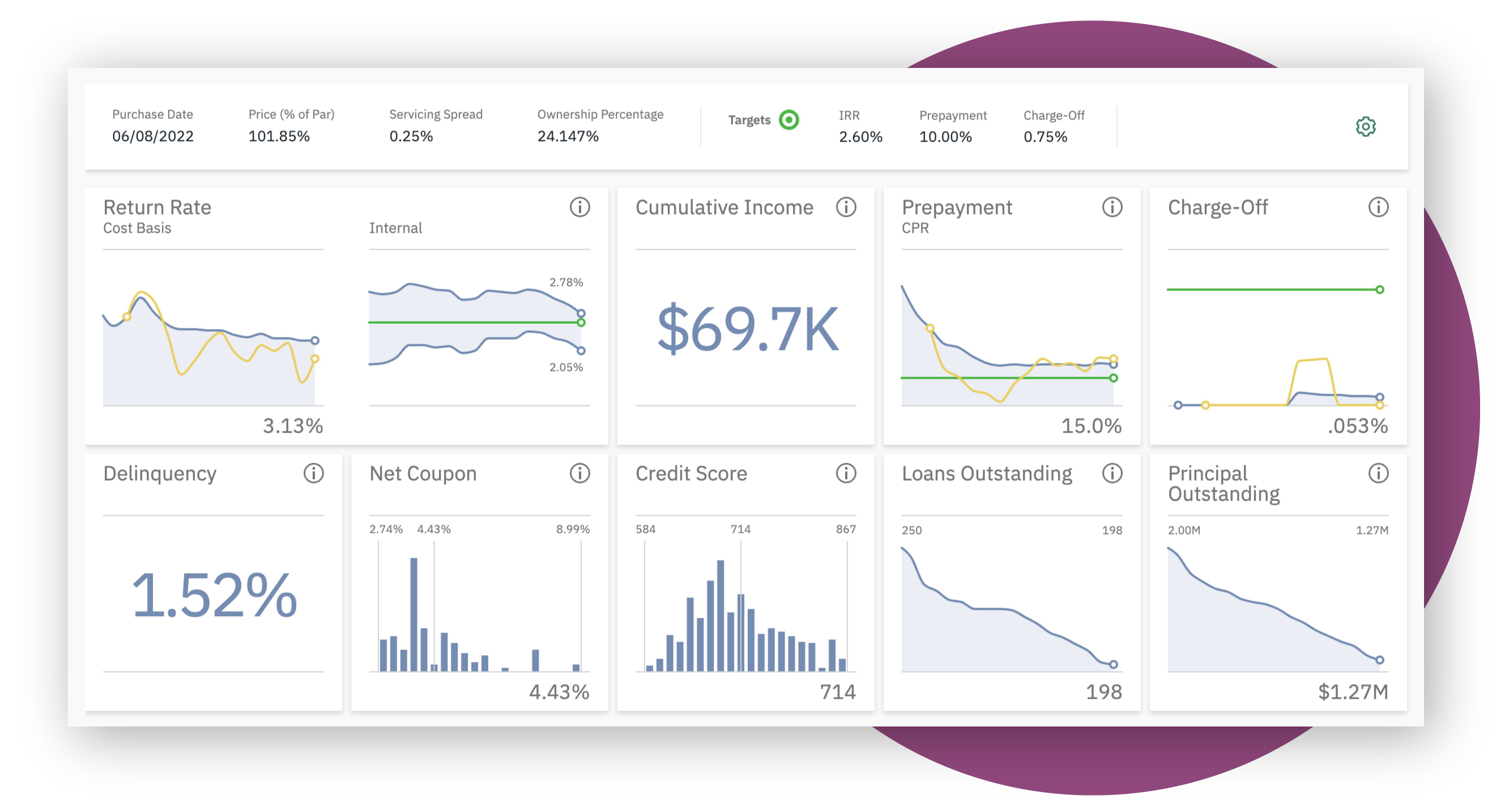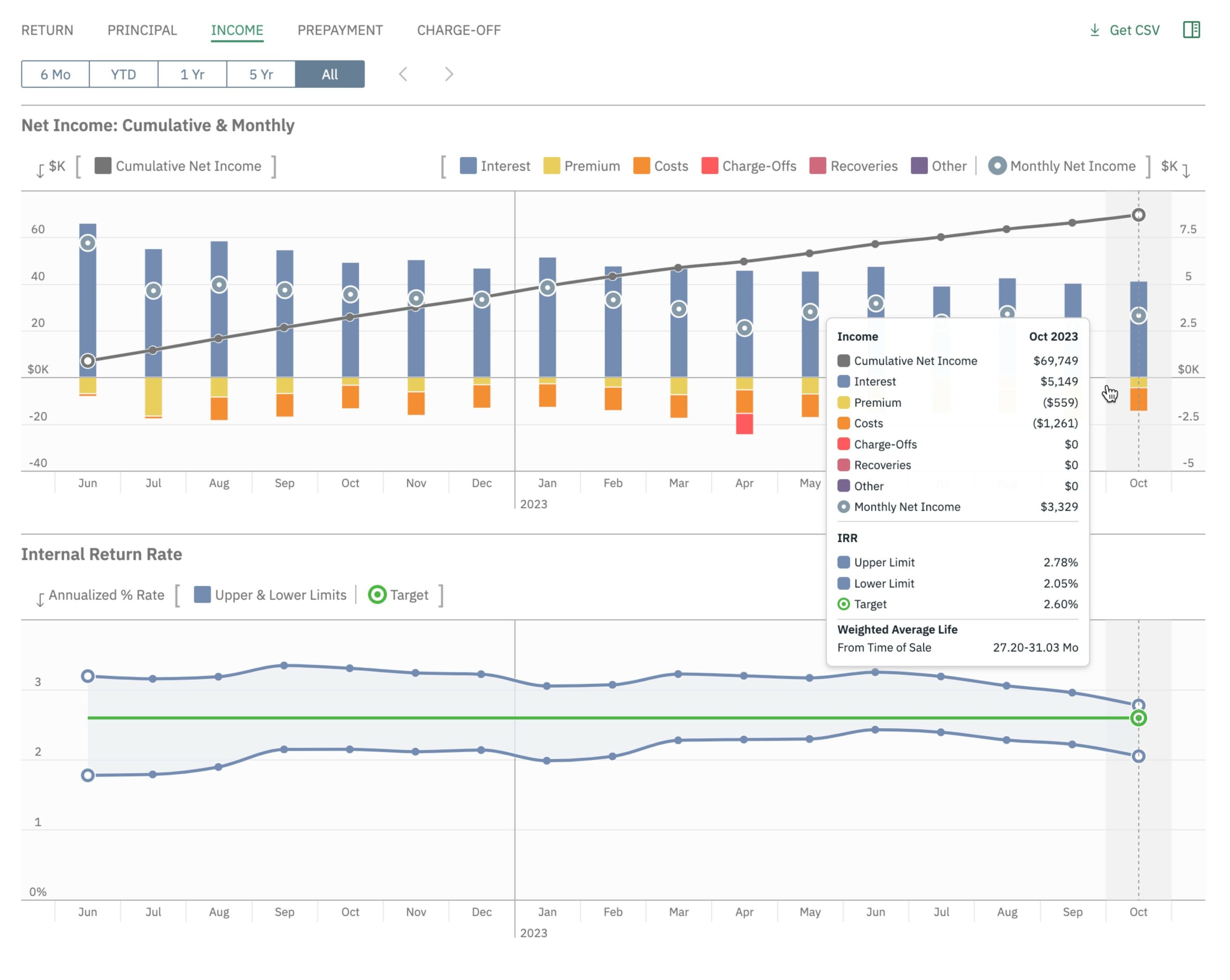 In-depth graphs and visualizations deliver a concise view of your loan pool or vintage performance and enable you to drill down into the details your monthly returns broken down by all of their component parts, including interest, premium, costs, charge-offs and recoveries.