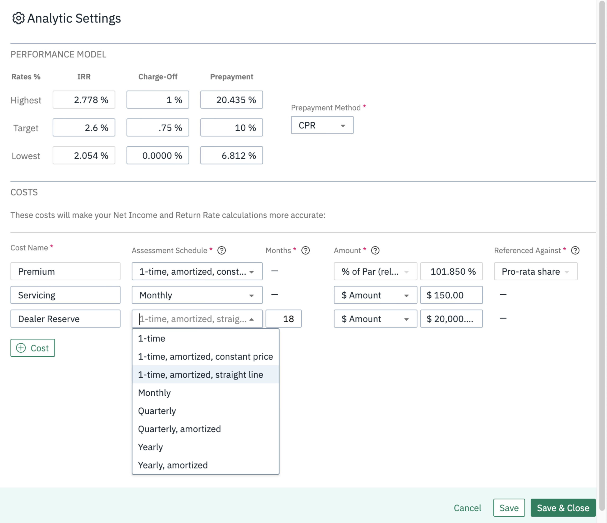 See how your returns are affected by amortization of premium or other costs that you define, from which LoanStreet calculates your future IRR estimates. Our premium amortization tools allow you to choose your preferred amortization method, and easily download customizable amortization schedules in .csv format.
