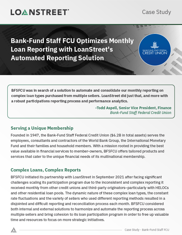 Bank-Fund Staff Federal Credit Union partnered with LoanStreet in September 2021 to help streamline its complex loan participation reporting in order to scale its participation program. The LoanStreet team was able to successfully resolve their biggest reporting challenges by establishing a fully automated system for their entire participation portfolio that identifies discrepancies and provides automated reports from their counter-parties.